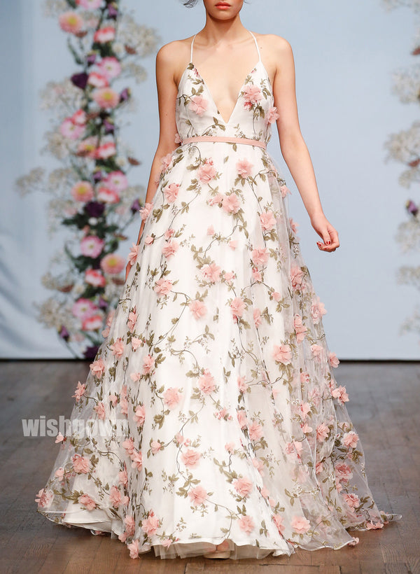 A-line Spaghetti Strap Flower Applique Long Prom Dresses PG1148