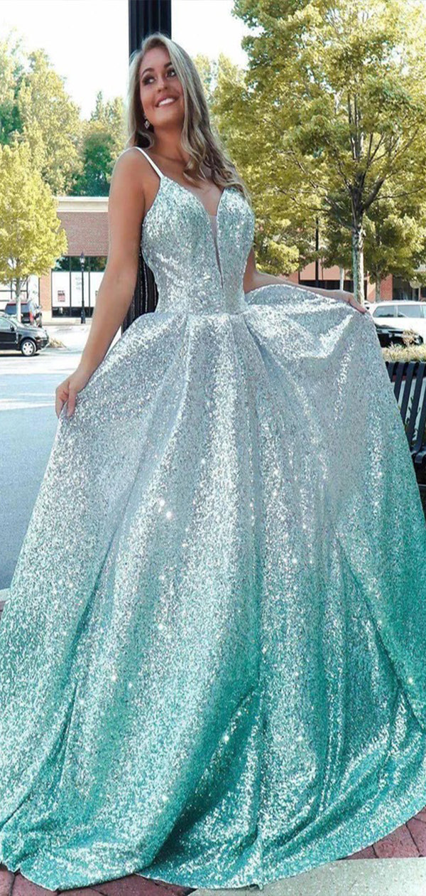 Sparkly A-Line Spaghetti Straps V Neck Sleeveless Sequin Cheap Maxi Long Party Prom Gowns,Evening Dresses,WGP413