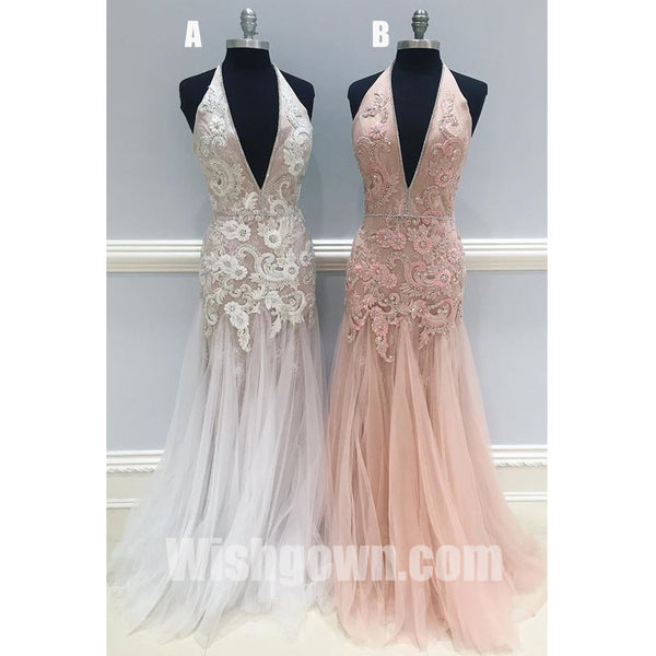 Charming Applique Tulle Hater Mermaid Deep V Neck Long Prom Dresses, WG1092