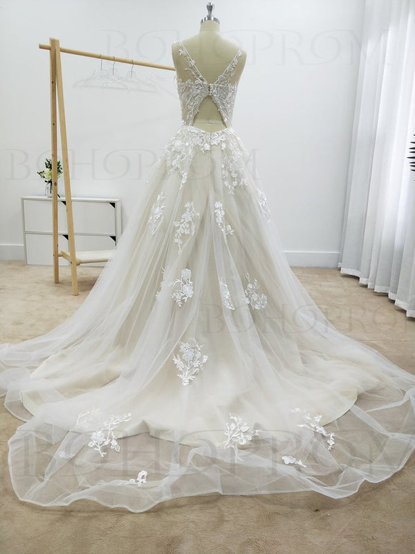 Romantic Tulle Appliqued A-line Wedding Dresses With Chapel Train, WGB019