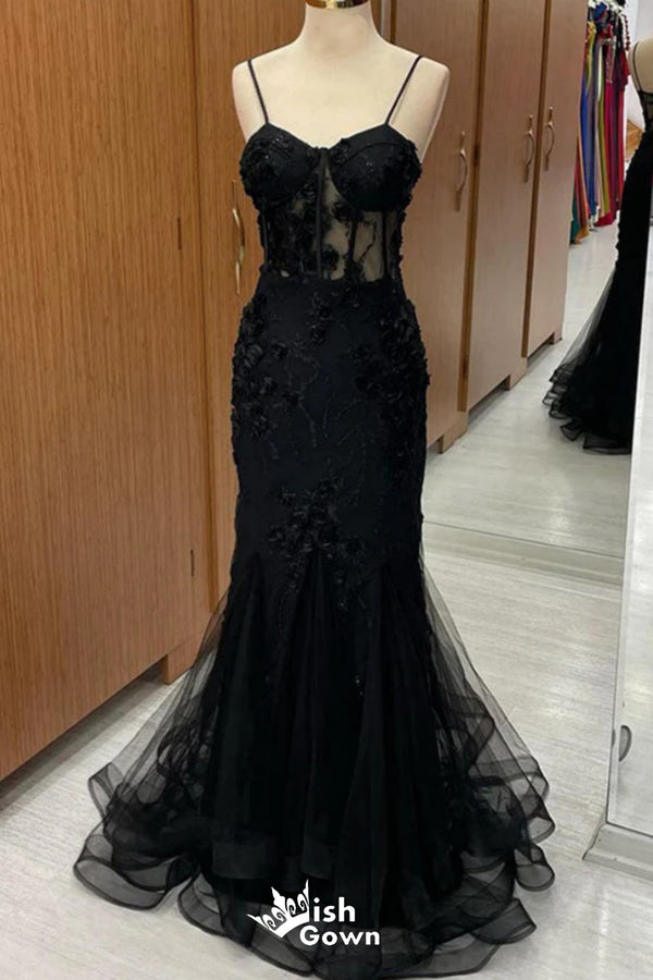 Black Lace 3D Flower Appliques Spaghetti Straps Mermaid Long Party Dress Prom Dresses,Evening Dress Online, WGP889