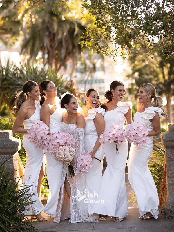 Wihite One Shoulder Satin Long Pleating Slit Wedding Bridesmaid Dresses, WGM041