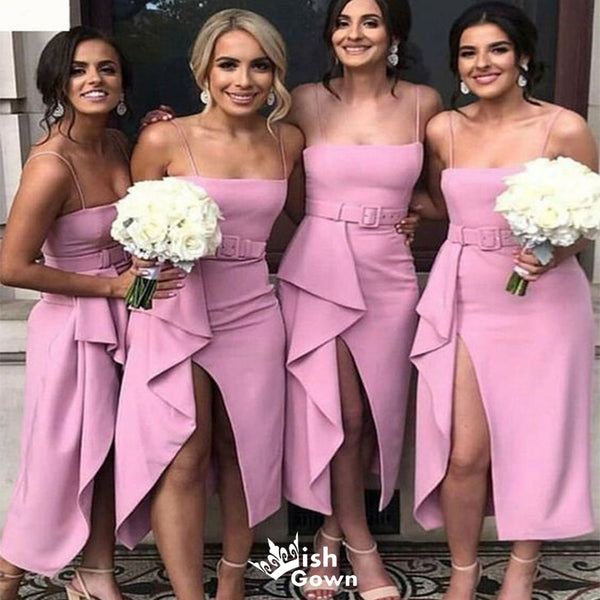 Elegant Pink Mermaid Spaghetti Strap Side Slit Ruffle Sleeveless Wedding Guest Bridesmaid Dresses,WGM352