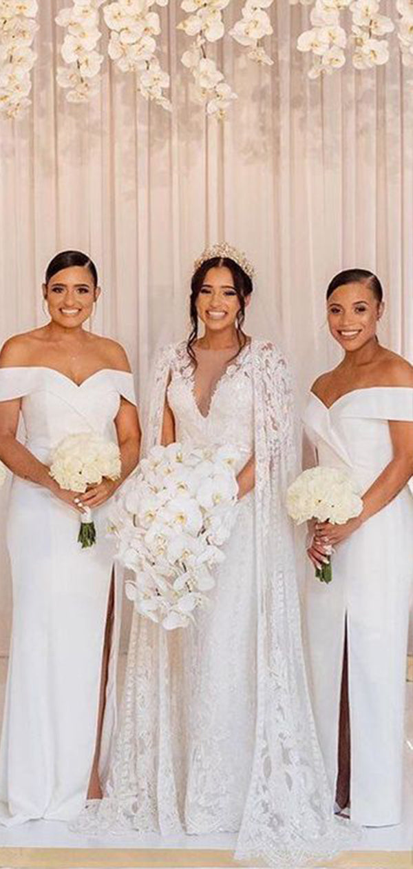 Elegant White Mermaid Sweetheart Off Shoulder Sleeveless Side Slit Popular Cheap Maxi Long Wedding Guest Bridesmaid Dresses,WGM318