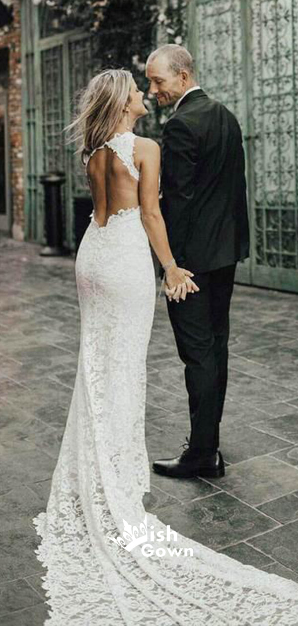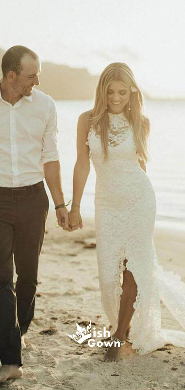 Halter Lace Mermaid Open Back Slit Beach Wedding Long Bridal Gown Dress, WGB013
