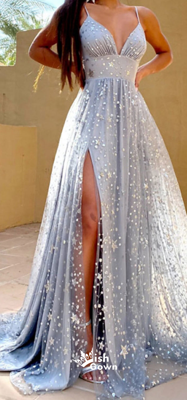 Spaghetti Straps Stars Tulle A-line Slits Backless Evening Gowns Prom Dresses, WGP232
