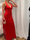 *haha you see the progression of my cat attacking my heels string lol* BEAUTIFUL dress!! I love how it fits and hugs me. The color is pink in a yellow light but red in white light. Perfect length and perfect for all occasions! Buy! 5'7 for reference.
