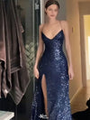 Shiny Blue Spaghetti Strap Mermaid Side Slit Long Prom Dress Ideas, Evening Party Dresses , WGP1580