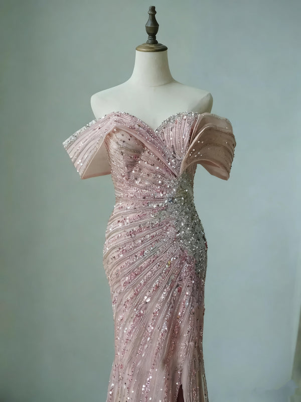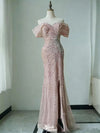 Sparkly Pink Off-Shoulder Mermaid Side Slit Long Prom Dress Ideas, Eve