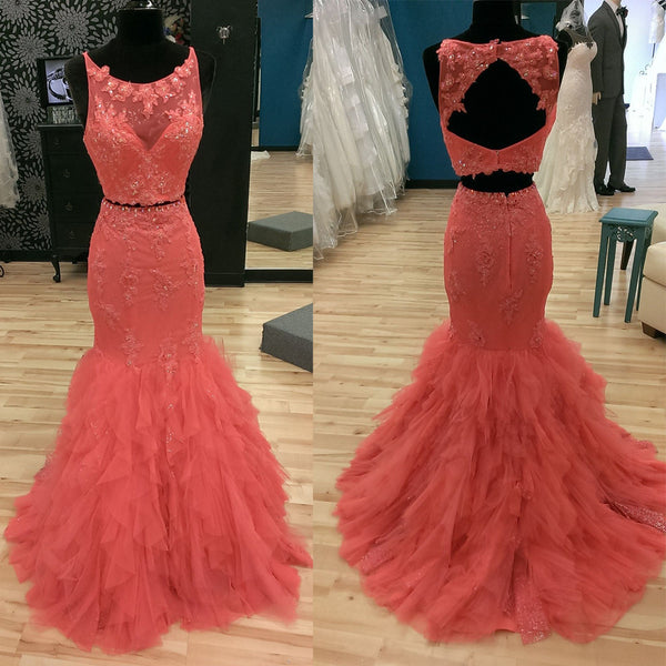 Two Pieces Open Back Applique Mermaid Long Prom Dresses, WG587