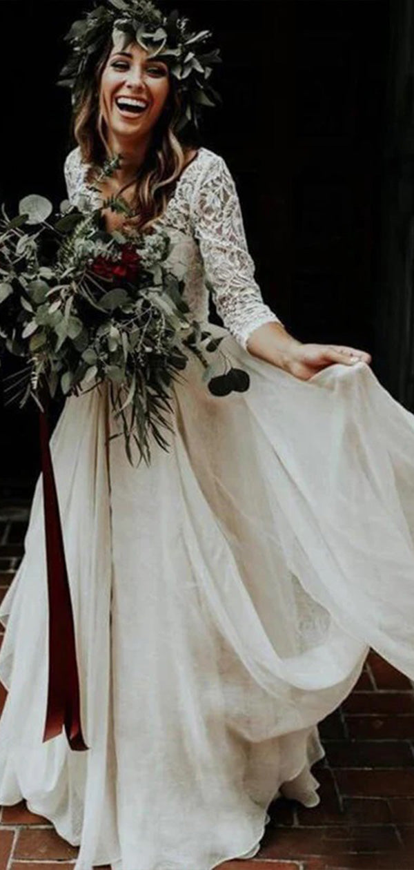 Elegant Tulle V Neck 3/4 Sleeve Applique Popular Bridal Long Wedding Dresses, WDH089